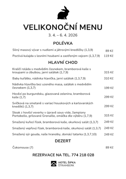 Velikonoční menu budeme podávat po celý den v rámci běžné otevírací doby restaurace. Doporučujeme si stůl rezervovat dopředu. Velikonoční víkend bývá u nás plný a byla by škoda se k nám nedostat.
